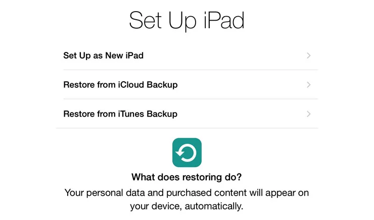 You'll be granted with three options: 1) Set up as New iPad, 2) Restore from Backup, and finally 3) Restore from iTunes Backup
