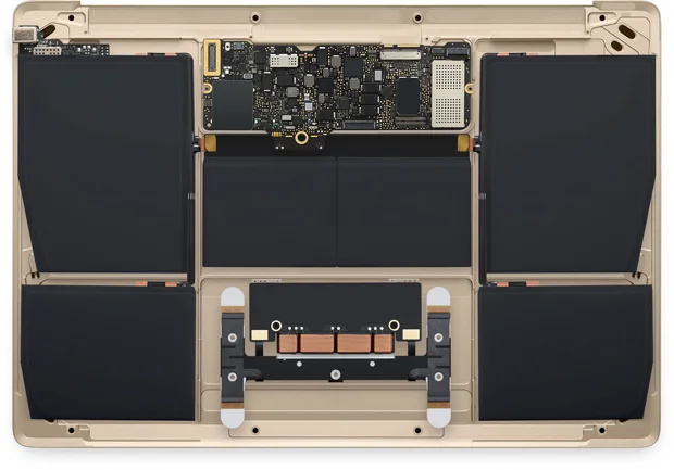 On the hardware front,the engineers at Apple manage to scale back on the logic board, its 67 percent smaller than what's in the MacBook Air. It's powered by a 1.3GHz Intel Core M processor that turbo boosts to 2.9GHz. Being that you have a logic board that is dwindled down to a smaller size and I might add there is no system fan, there is room for a additional batteries. Apple are used a "sheet " batteries for its design, this allows engineers to cram more batteries into its chassis. Apple states that this method allows for a all day battery life ,which for the sake numbers is 9 hours.