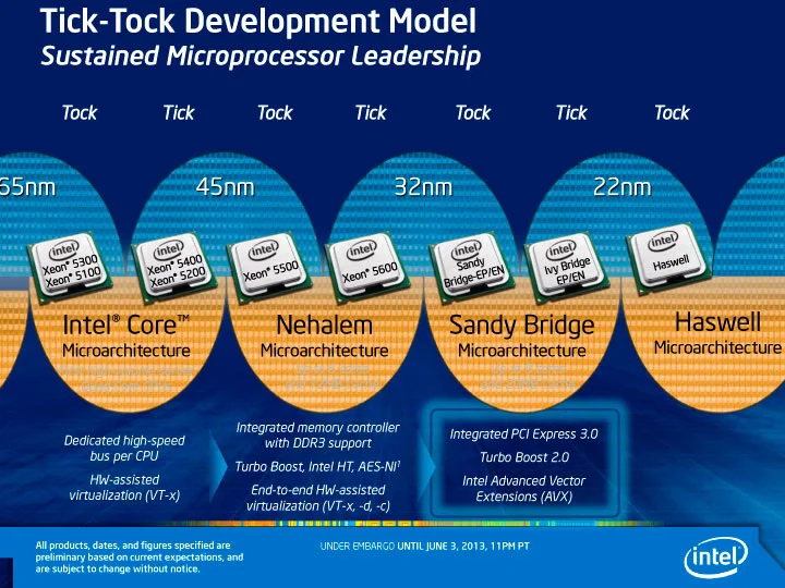 To explore this even further,the tick! always features enhanced performance and energy efficiency on a much smaller,more refine silicone chip, while in the Tock! phase Intel processors deals with the optimizing value of the increased number of transistors thats left available by the tick. Basic integration of updates within the processor.