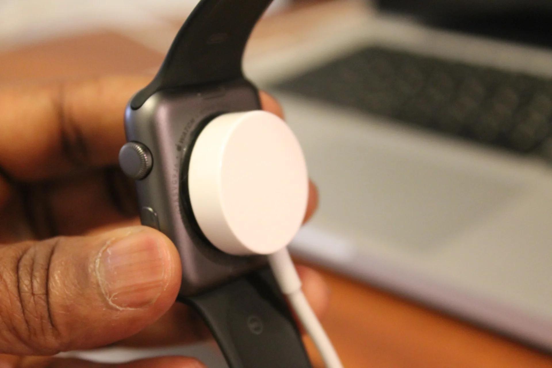 The Apple Watch uses what its call MagSafe technology for inductive charge. The charging mechanism connector is magnetize,so you simply just place the connector onto the back of the Apple Watch and the charge process will begin immediately. This is of course wireless charging which Apple is a bit late in the game with this technology. I'm hoping we'll see wireless charging with the next generation iPhone or iPad.