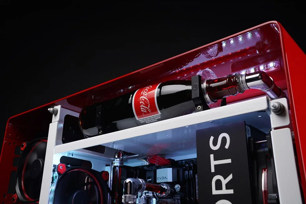 In full description, on the outside of the case is decked out in iconic red color brilliantly painted by MainGear using automotive paint quality which is their signature. There's an actual soft drink company logo on the very front and center of the PC, you see it? Already blown away by the PC because its, well insane looking includes an fully functional coolant reservoir replicating a Coke bottle incorporating the company's signature markings, pure genius I say.