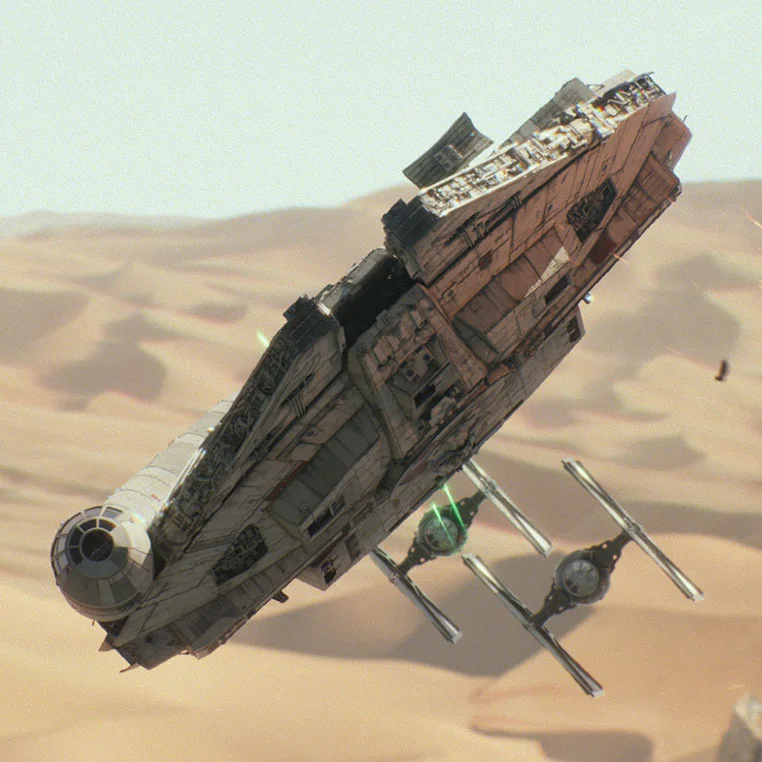 The Millennium Falcon is a YT-1300 light freighter class which have a very distinctive shape that come in the form into two convex saucers that's welded together, pair of front facing mandibles and a side mounted cockpit with steel viewing ports. Suffering from a barrage of breakdowns during battle, the Millennium Falcon have gone through many customization, like for for instance during the battle of Endor the signature circular military grade sensor dish was lost, you know the scene when the ship was going through the maze like tunnels in the Death Star. That dish was replaced with a more base like rectangular model which by the way was actually supplied on the ship.