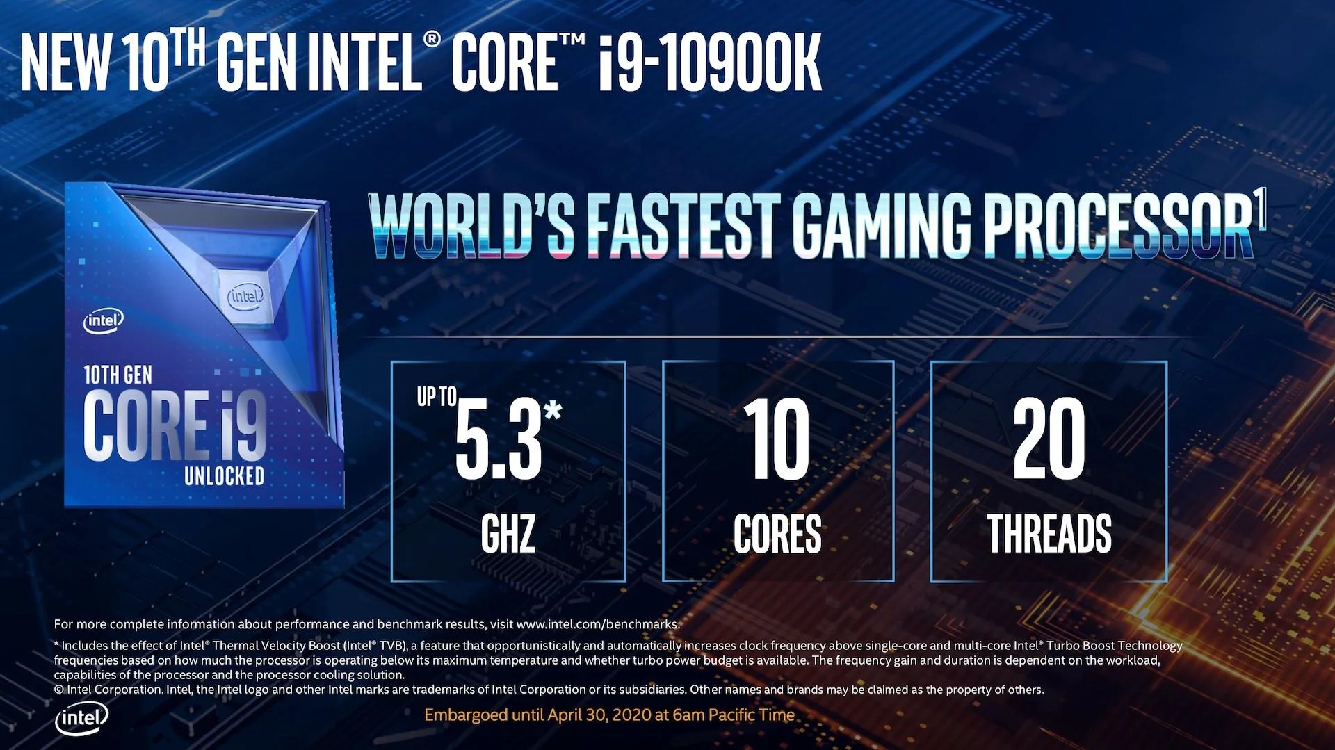 Let us start with the core speed of the Core i9-10900K, which is up to an astounding 5.3GHz. Even more impressive is its 10-cores, with 20-threads. By far, the fastest single-core clock speed processor Intel has ever produced. Mainly because there is the technology behind the processor insane speed, call the Thermal Velocity technology. Which enables temporary high performance on top Turbo Boost technology, automatically increasing the processors clock frequency. The processor will also have a much faster DDR4-2933 support, Intel Turbo Boost Max technology 3.0, and enhanced overclocking features.