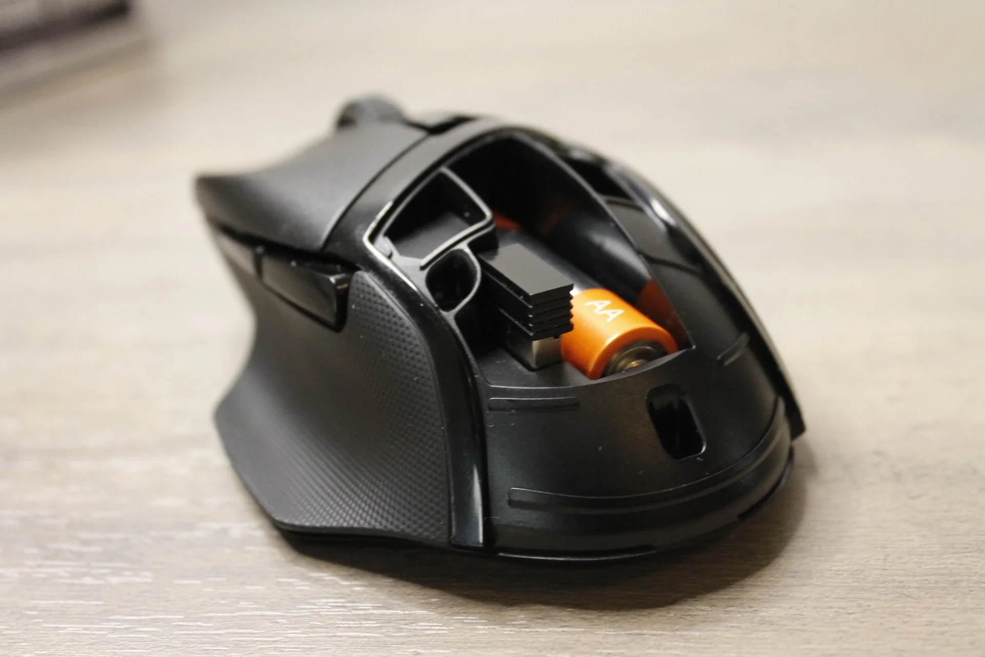 Beyond that, you have the standard right button, and a left button, the scroll wheel, and an LED illuminated DPI button. If you open the mouses cover, the compartment stores the battery ( 1 single AA) and wireless dongle. Next, flip the mouse over; on the bottom, you'll find the power switch that also converts between 2.4GHz wireless and Bluetooth signals.