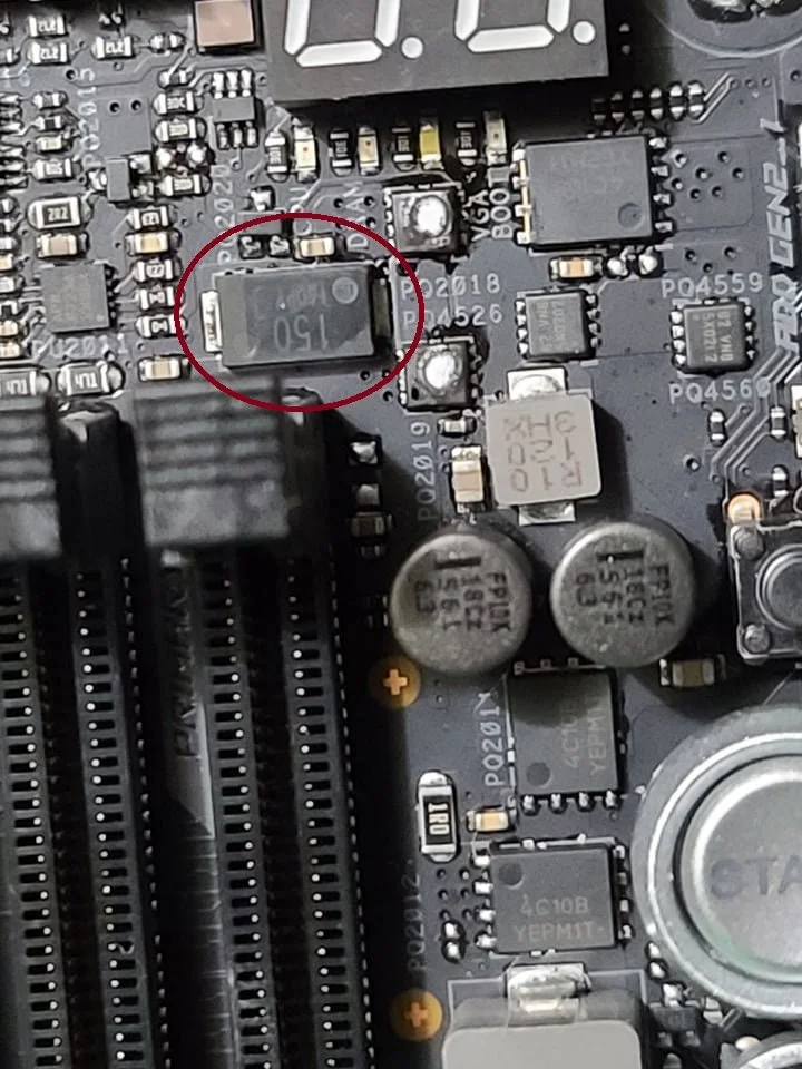 While there are burns on two MOSFETs, the core problem is the memory capacitor labeled "150" displayed in this post. You can see the memory capacitor is positioned incorrectly—much respect to Asus for promptly addressing this issue.