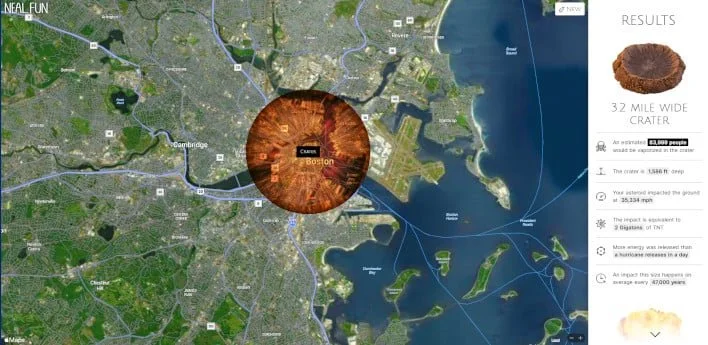 After the simulated Asteroid makes its impact, you're shown a full detail of the disastrous events, and it's quite scary. Then, you're given an estimate of how people would be vaporized within the crater. You also get the view of how deep the crater would be, the speed of the Asteroid, and how many people would receive 3rd-degree burns.