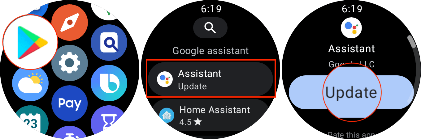 First and foremost, make sure to apply the needed updates to your Samsung Galaxy smartphone and watch. Swipe up from the button on the Galaxy Watch 4, 2. tap the Google Play icon, 3. tap the magnifying glass button and search for Assistant, 4. After it loads, tap the Google Assistant app that's listed, and tap the update button. At this point, the update should be finishing its update.