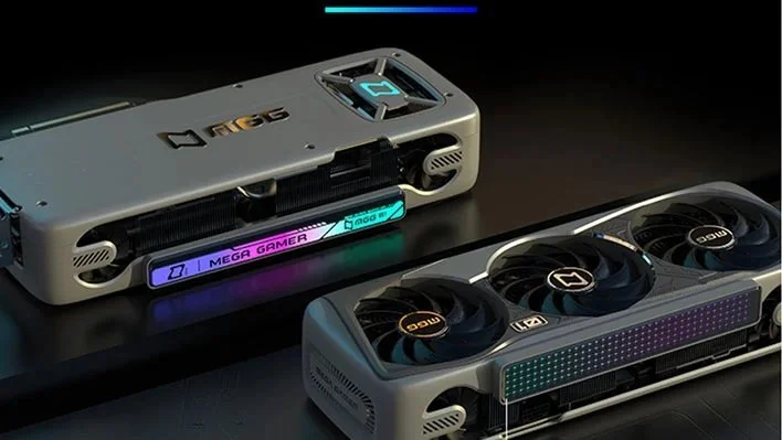 The makeup of the cooling setup is unique, with the traditional three cooling fans on the bottom of the GPU, but there are two extra small fans in the upper portion of the enclosed case. Now, what's a unique cooling arrangement without RGB lighting? Which the MaxSun RTX 4070 graphics card has. Its very over-the-top RGB lighting resembles the bright city lights of Tokyo. The enclosed case design that seats the graphics card has nice, smooth, curved edges with an all-gray color scheme.