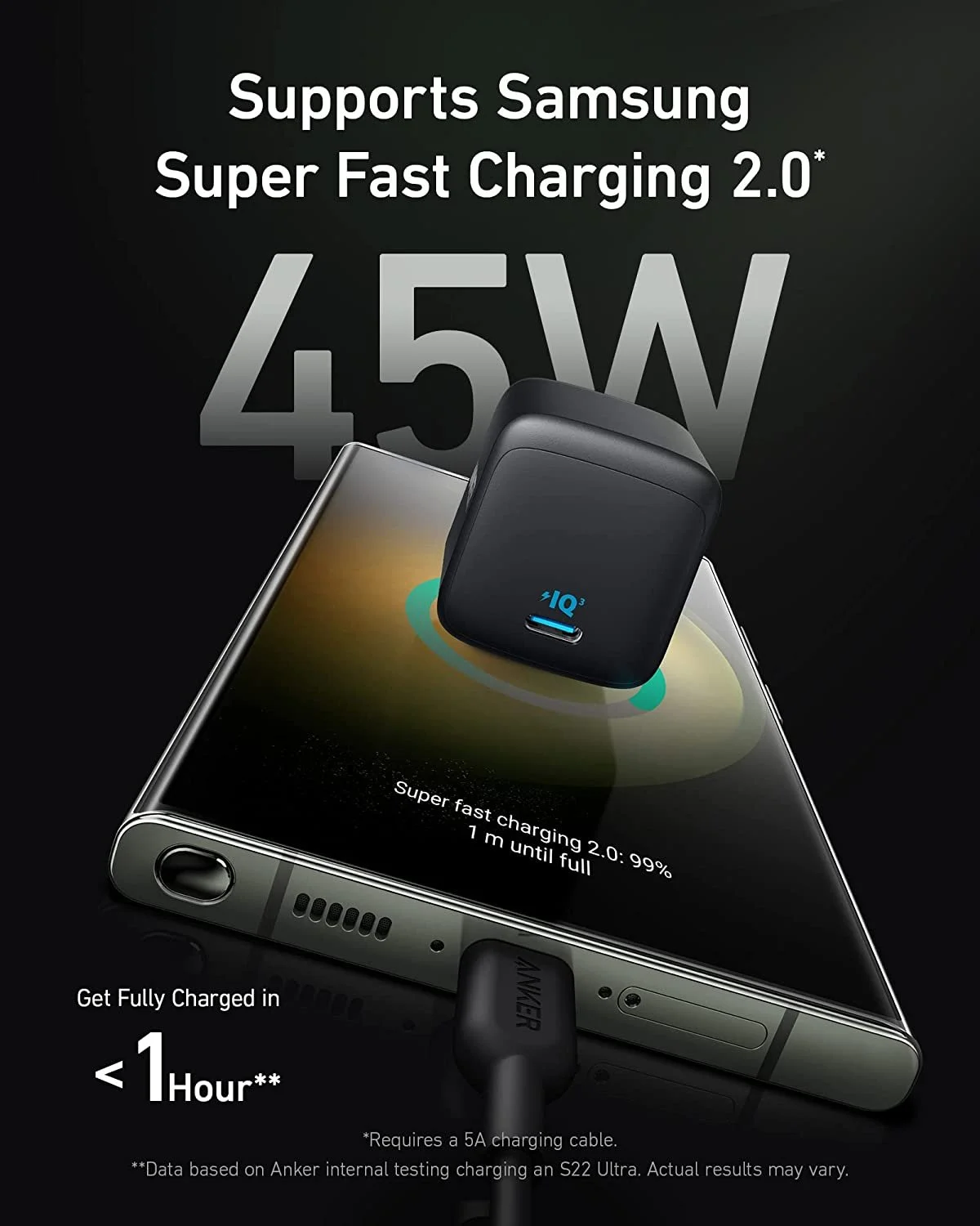 The Anker 313 is marketed as being the official charger for the new Galaxy S23 series smartphones. However, the charger is also capable with other smartphones, including the last-gen Galaxy Series smartphones, Androids Google's Pixel, and Apple's latest flagship smartphones ( iPhone 14 Pro Max, iPhone 14 Pro). The Anker 313 45w charge can also power up an Apple MacBook Pro laptop, tablet, and smartwatch. In addition, any device with a USB Type C port will provide a charge.
