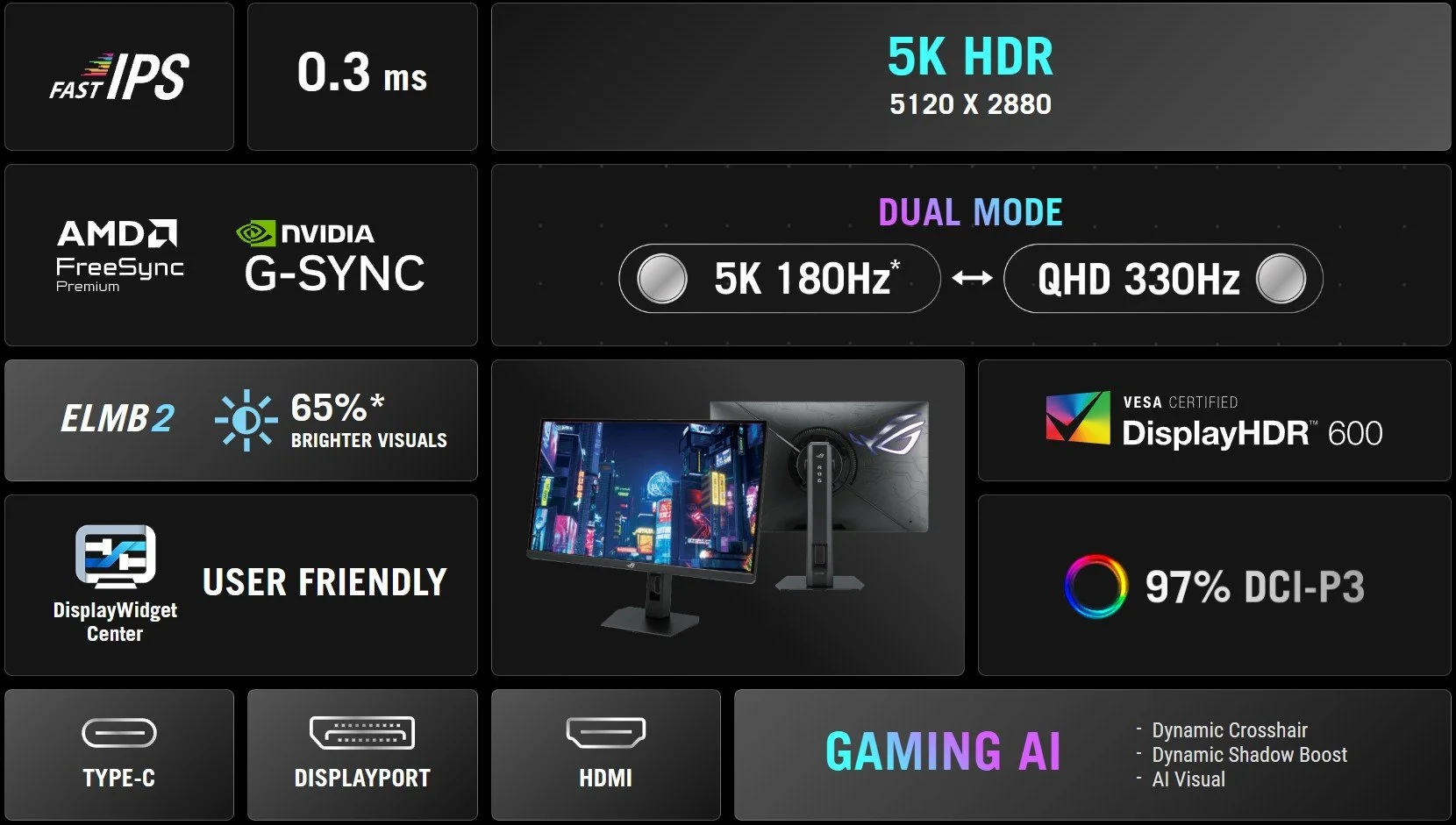 The gaming monitors feature the following specifications: native 5K (5120 x 2880) at 180Hz, switchable to QHD (2560 x 1440) at 330Hz. The 27-inch display's panel technology is fast, with a 0.3ms gray-to-gray response time, ensuring sharp visuals with minimal blurring.