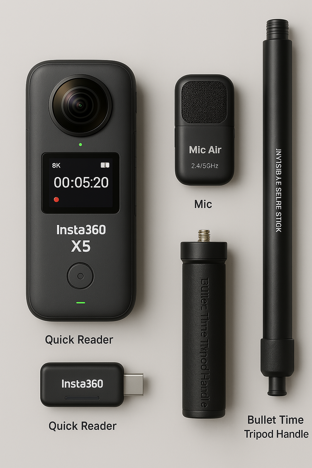 The Insta360 X5 comes with accessories, including the Mic Air microphone, which connects directly to the X5, providing 48kHz 24-bit audio with noise reduction and remote control capabilities. In addition to the Ultimate Creator Bundle, it also includes the Bullet Time Selfie Stick 2.0 and Quick Reader for fast data transfer and pass-through charging. The optional accessories are an expanded toolbox that brings high-quality audio and cinematic effects, making your content pop.