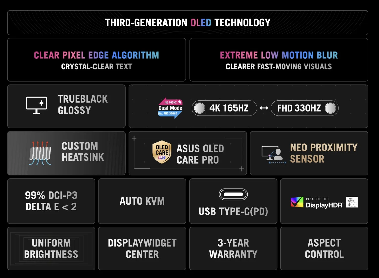 Gamers will have the ability to toggle between 4K at 240Hz and Full HD at a blazing 480Hz refresh rate, thanks in part to the monitor's versatile dual-mode feature. Its flexibility will cater to users who engage in visually immersive cinema and fast competitive gaming. To prevent OLED burn-in, ASUS has implemented the OLED Care Pro suite, along with a Neo Proximity Sensor that dims the screen when the user steps away from the display. Additionally, the monitor features AI-powered enhancements, including Dynamic Crosshair and Shadow Boost, which further enhance gameplay with increased precision.