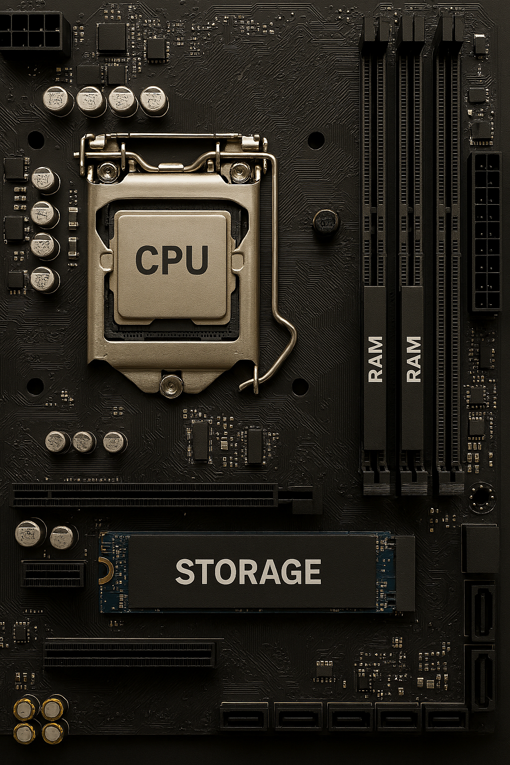 The motherboard is the main printed circuit board ( PCB) inside the computer. It connects the CPU, RAM, storage drives, graphics card, and other components. It distributes power and enables communication between all hardware.
